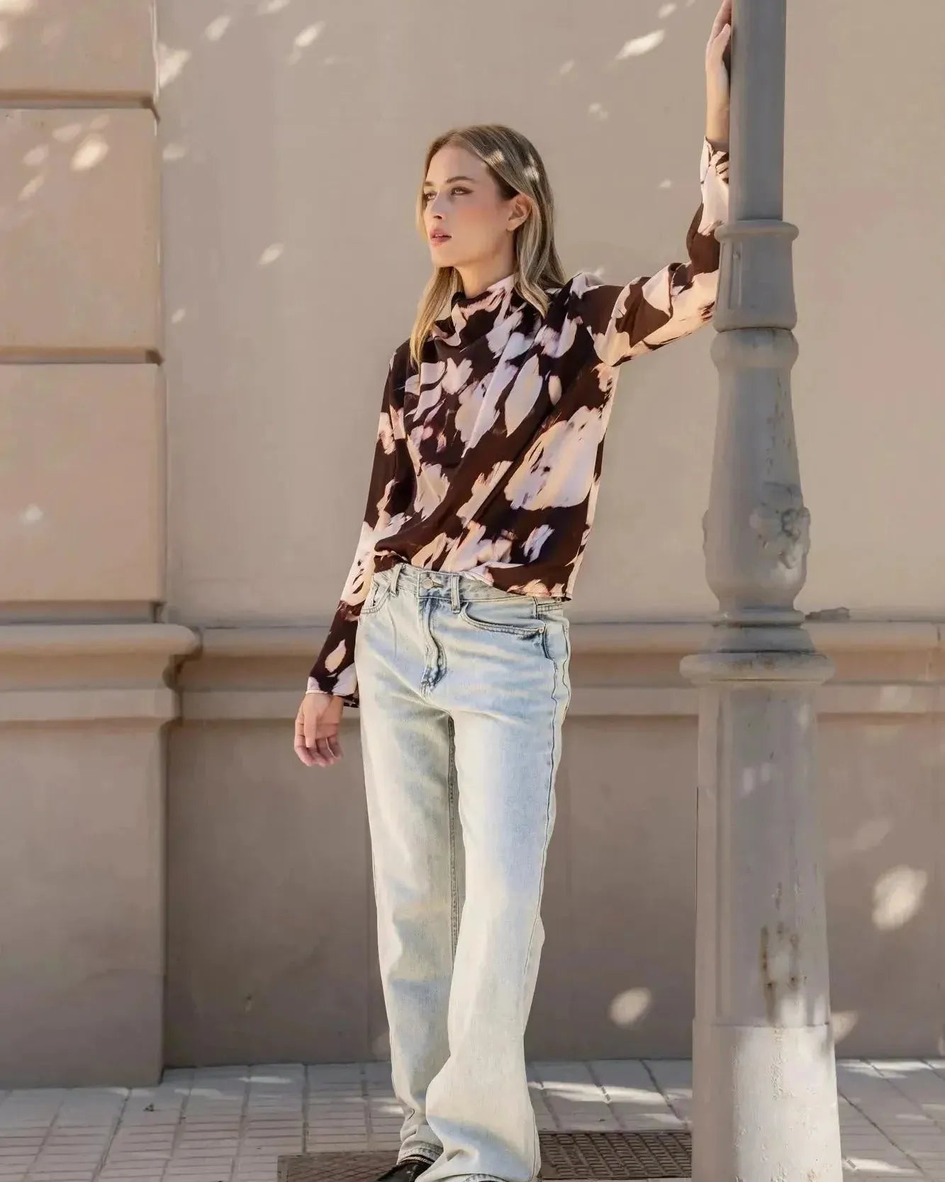 - Des accessoires minimalistes pour laisser le design de la blouse s'exprimer.