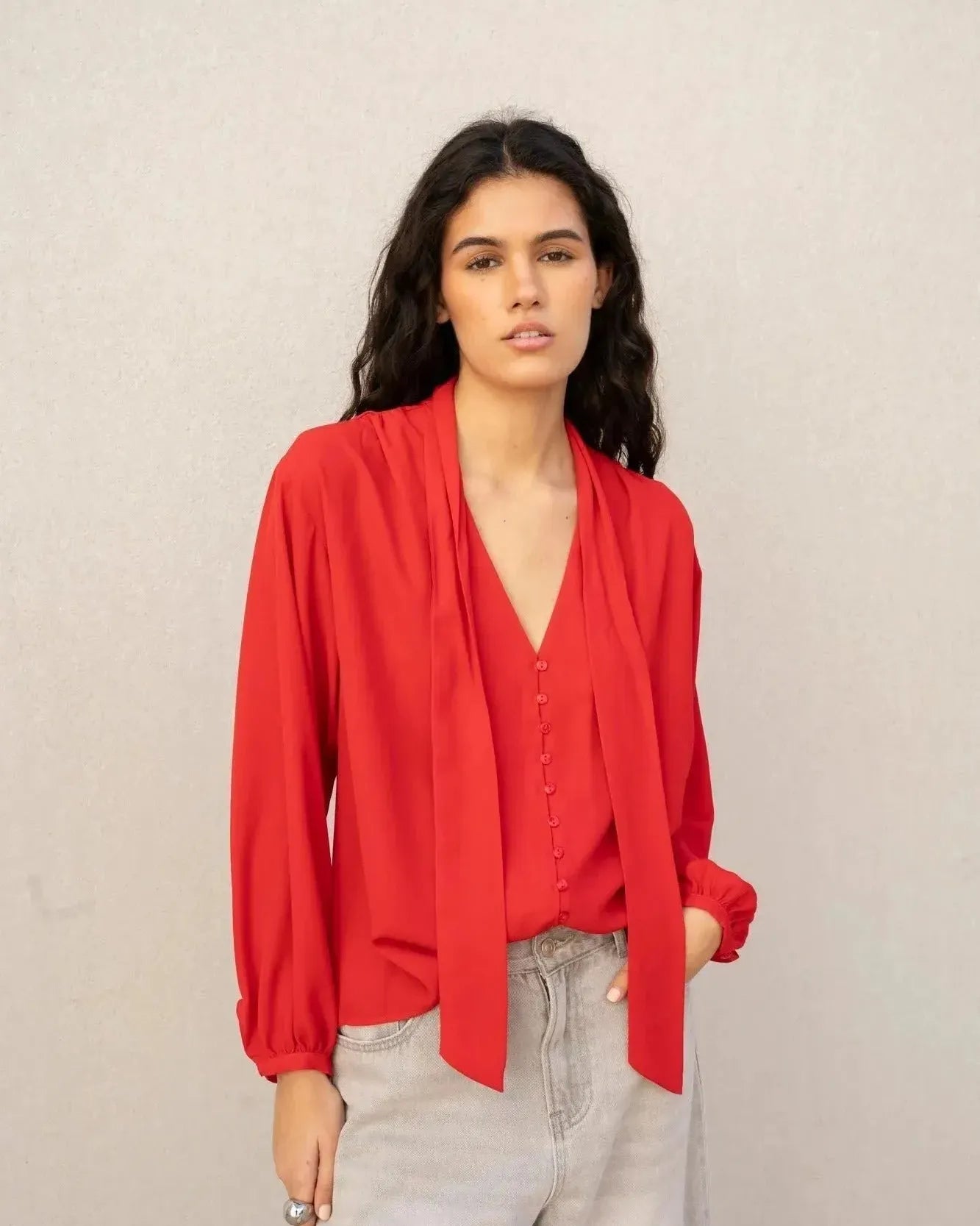 Chemisier Col Lavallière Femme Rouge Fluide à Manches Longues - Chic et Élégant