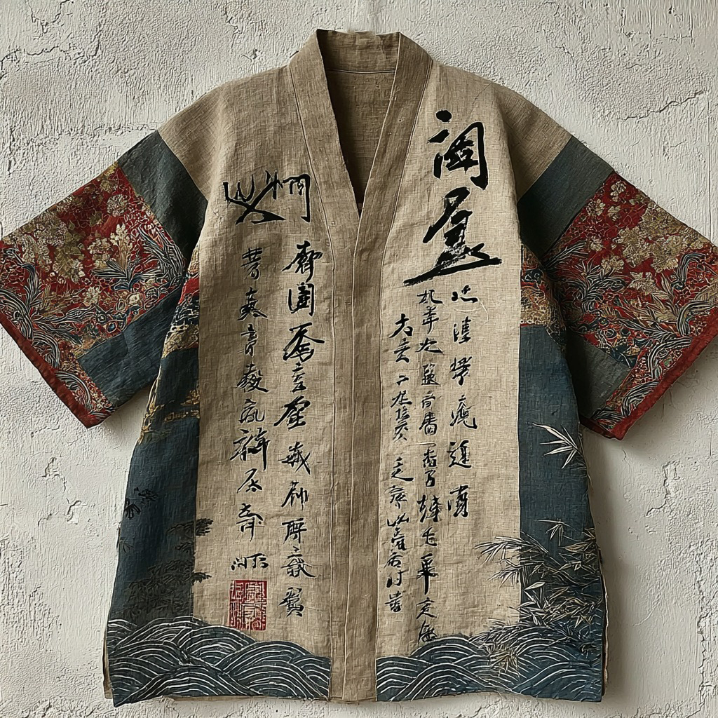 Japanese Calligraphy Art Contrast Color Linen Kimono Cardigan