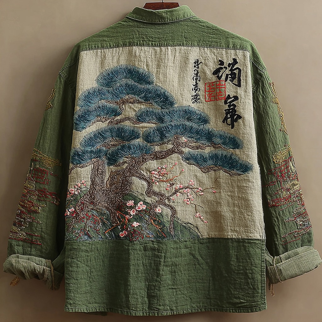 Japanese Pine And Cherry Blossom Embroidered Linen Men's Long Sleeve Shirt