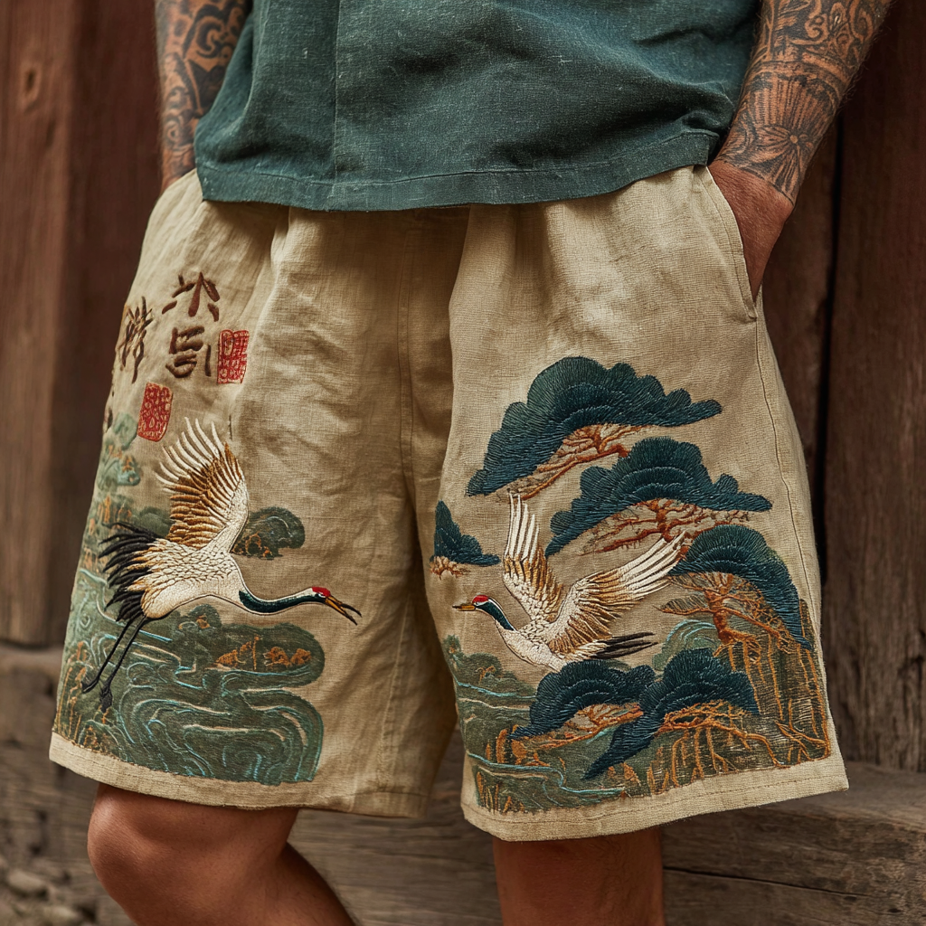 Japanese Pine And Crane Embroidery Art Linen Blend Shorts