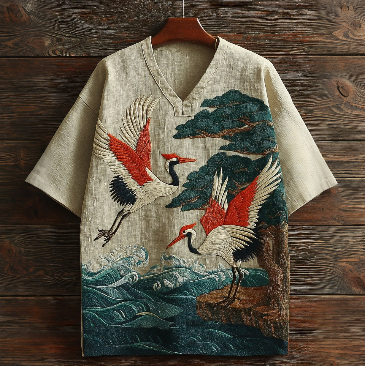 Men's Japanese Crane Embroidery Art V-neck Linen T-shirt
