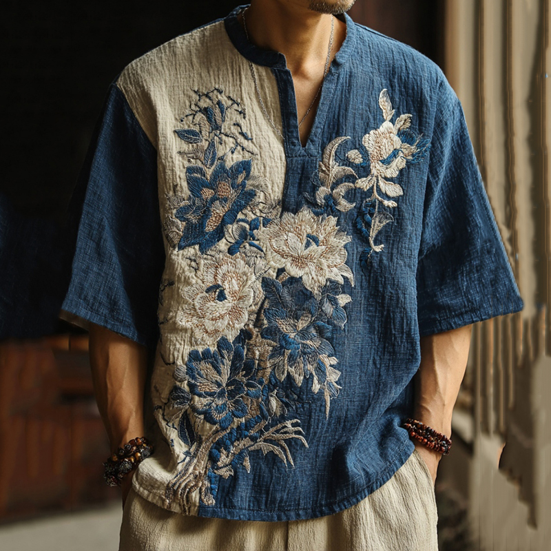 Men's Retro Floral Embroidery Color Block Casual Short Sleeve Shirt