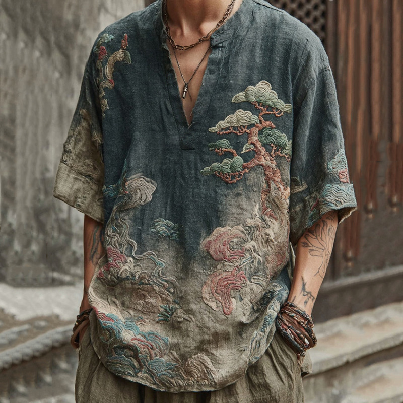 Men's Retro Pine And Cypress Embroidery Casual V Neck Short Sleeve Shirt